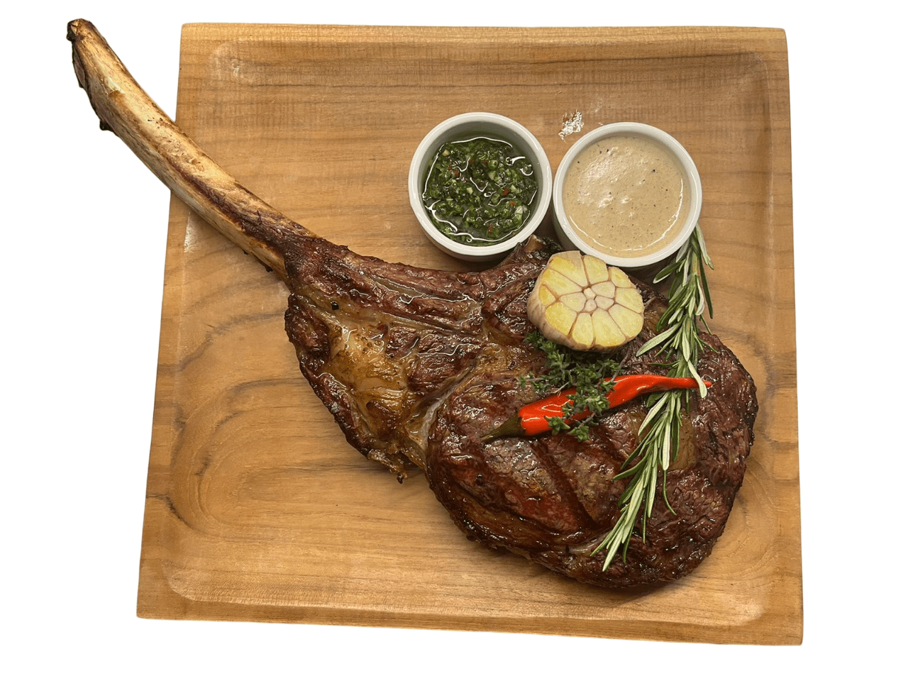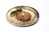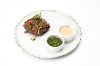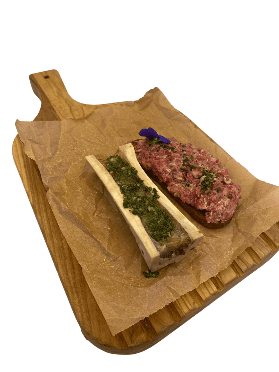 切碎的大理石牛肉,配以波罗底诺面包,骨髓,用蒜蓉酱调味。