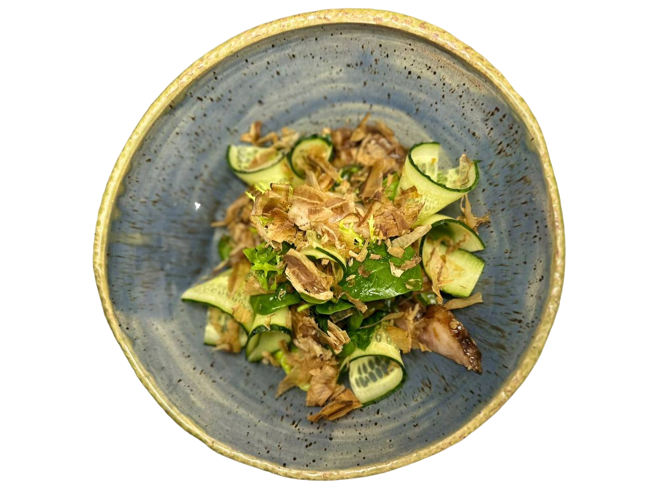 腌制西葫芦片配菠菜叶,鳄梨片和炸马加丹虾
