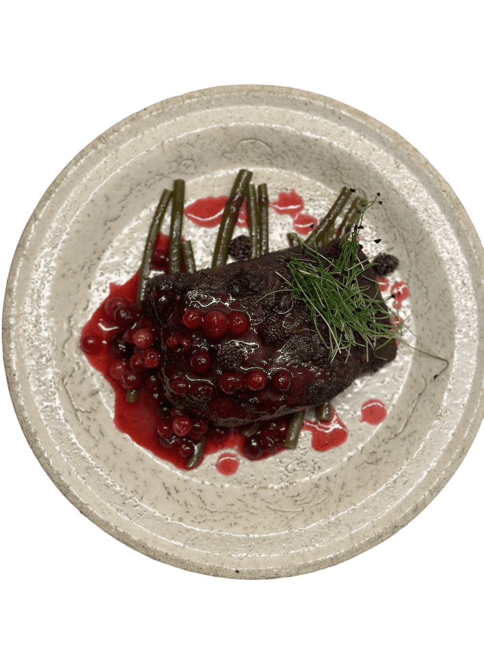 "царская добыча"熊里脊配越橘酱和腌蕨菜。