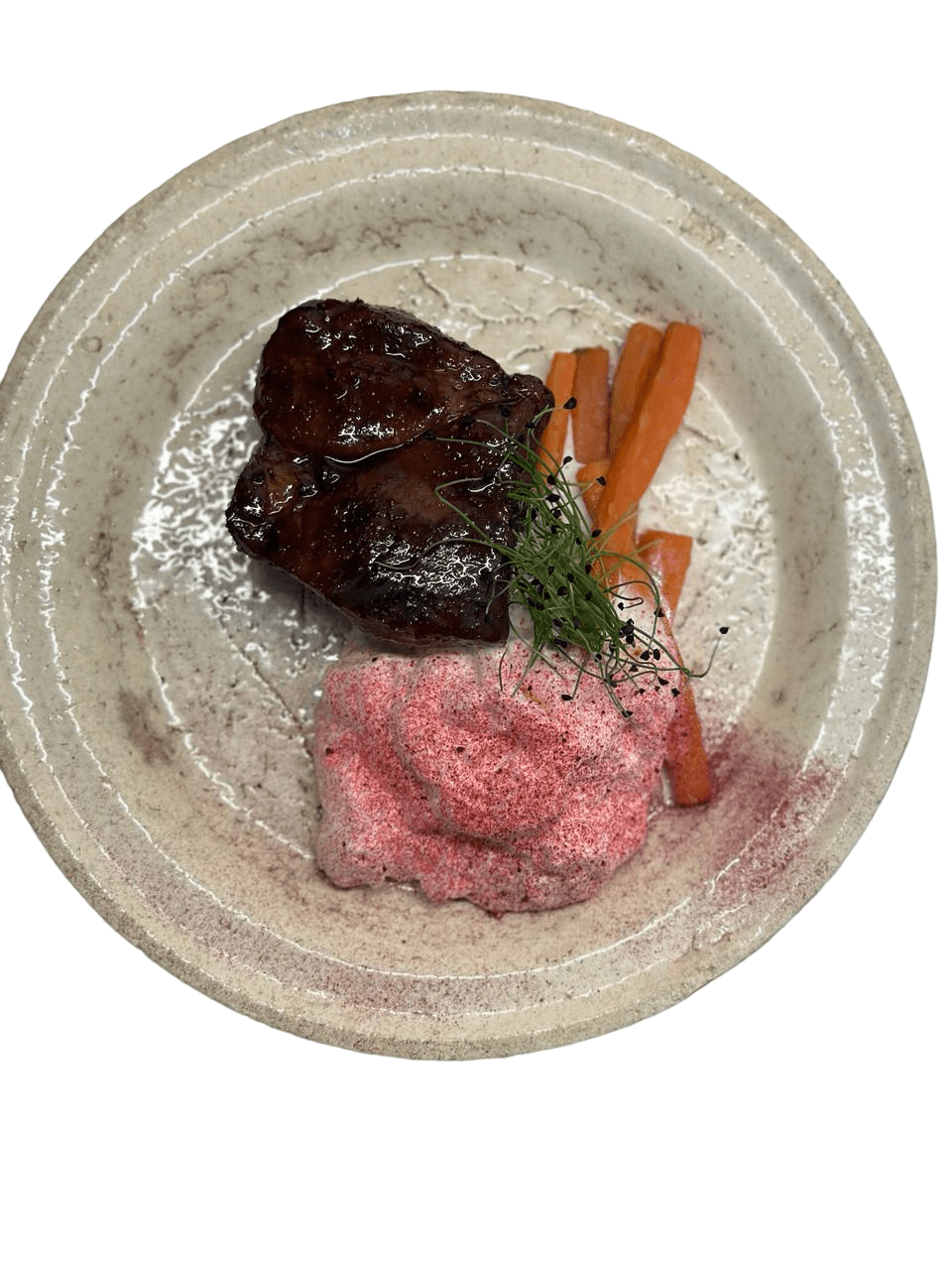 烤和烟熏甜菜根切片,配上精致的山羊奶酪奶油和黑加仑酱220克