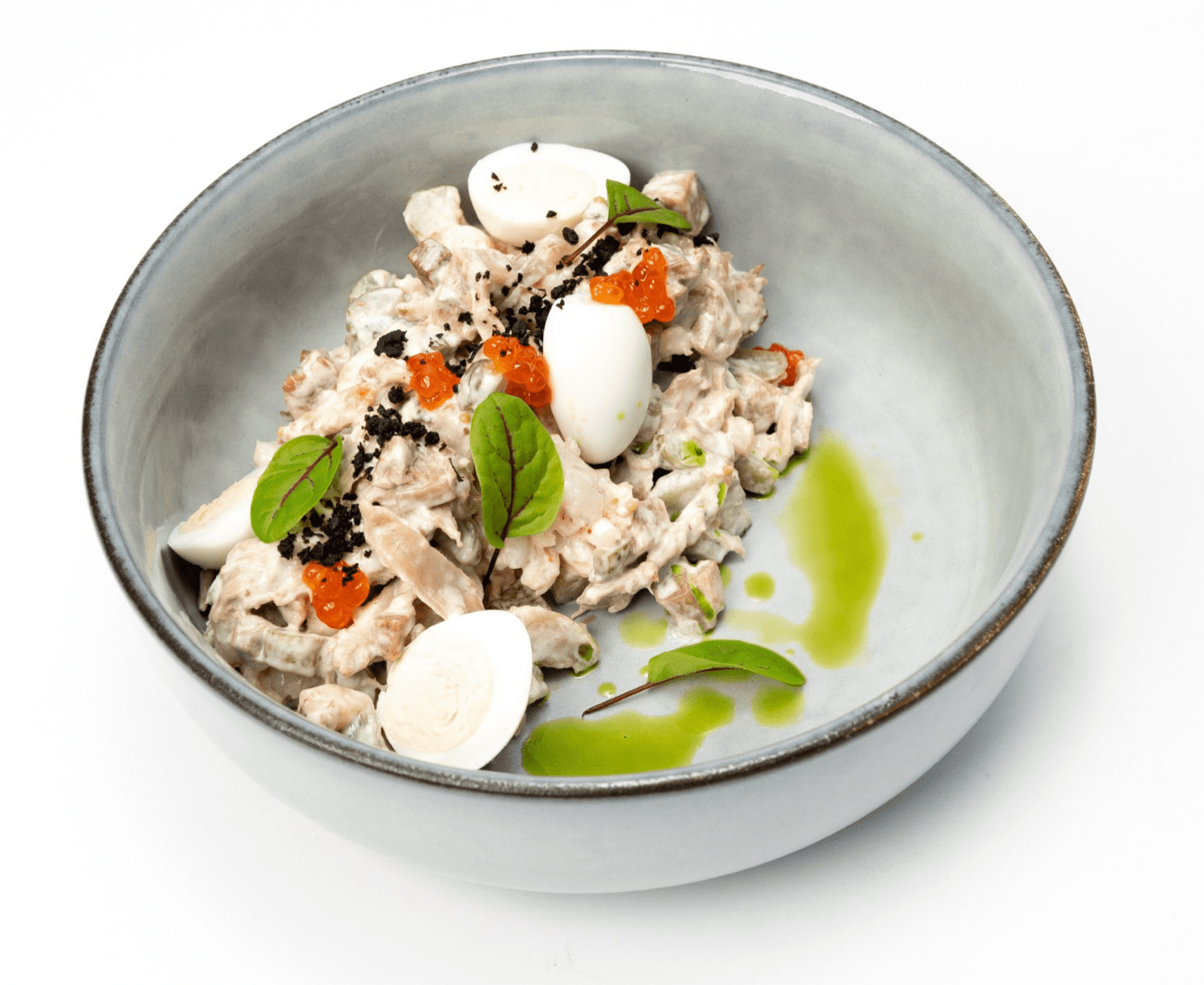 沙拉 "伯爵奥尔洛夫"是格里戈里-奥尔洛夫伯爵的个人形象的集体体现,它通过烹饪的棱镜,将海鲜和肉类共生的大胆近乎精致的口味结合在一起。