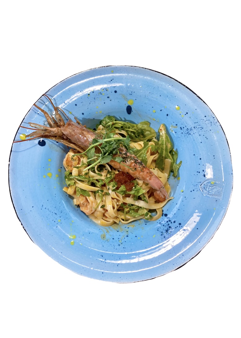 РАВИОЛИ С ГРЕБЕШКОМ馄饨馅料:扇贝和虾,配佩科里诺奶油酱和红色鱼子酱